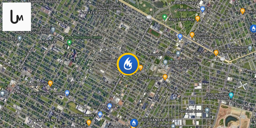 Maffitt & N. Vandeventer - Vacant two story brick building, heavy fire showing throughout. Exposure building on Side D. Defensive operations underway on the primary fire building. STLCity Truck Company 10 is first due. Battalion 1 is in Command
