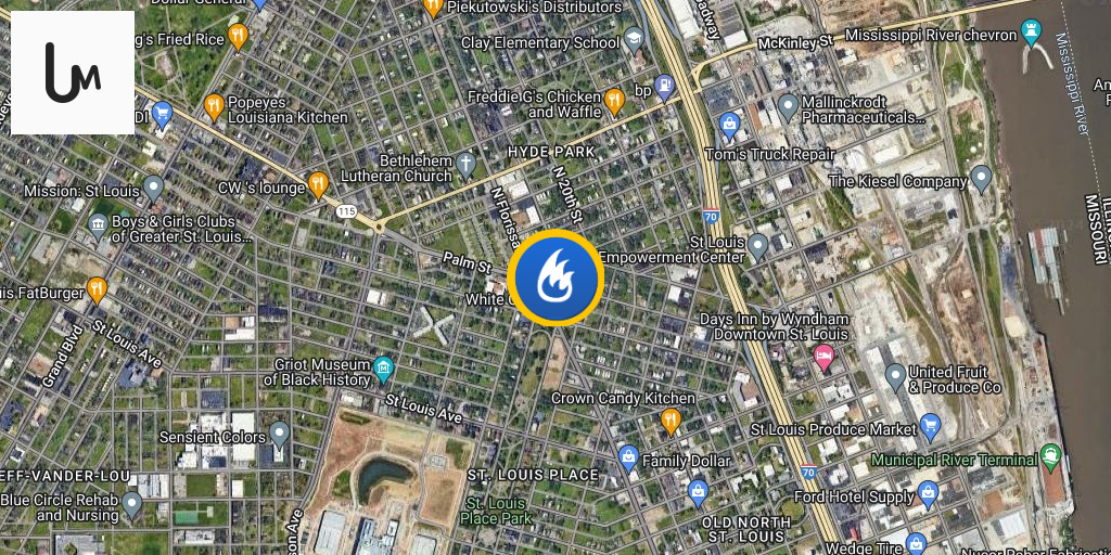 2900blk of Palm - Vacant two story brick building, heavy fire showing on the first floor. One line deployed. Primary search underway. STLCityEngine Company 8 is first due.Battalion 1 is in Command